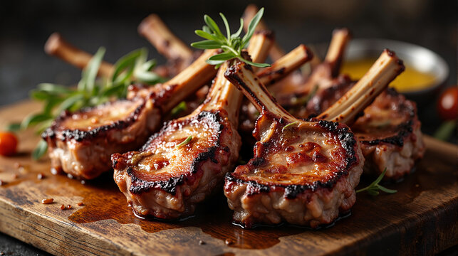 Chef marinating lamb chops with olive oil and herbs in kitchen