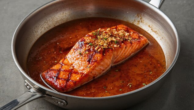 Salmon fillet placed in sauce within a cooking pan, highlighting flavorful preparation