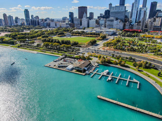 CHICAGO, ILLINOIS, UNITED STATES - DEC 11th, 2015: Aerial view of Chicago downtown at twilight from John Hancock skyscraper high above