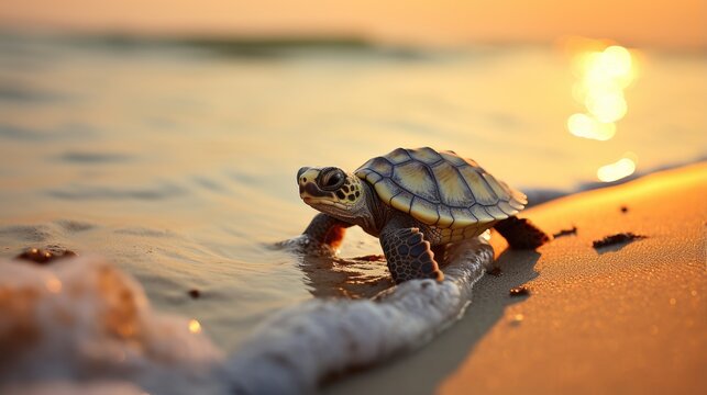 Turquoise surf lapping soft white sand beach showing footprints and shells at sunrise