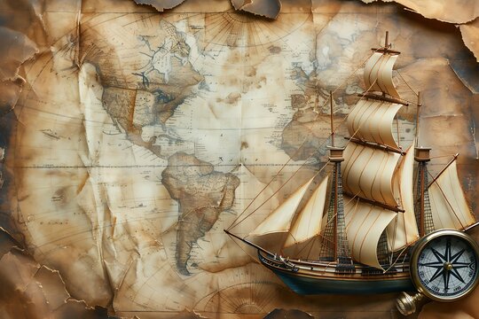 old pirate map on stone table, ancient candle, ship rope, pirate table