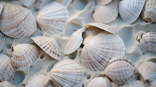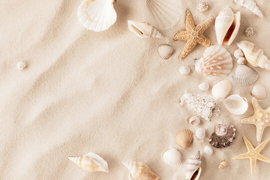 Sandy beach with collections of white and beige seashells and starfish as natural textured background for summer holiday and vacations concept.