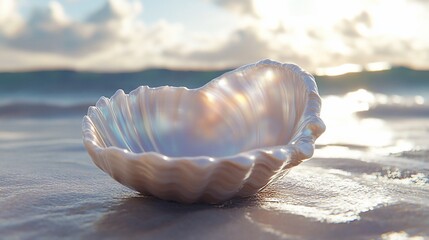 Glowing seashell on a beach at sunset, reflecting warm sunlight and surrounded by glistening water and soft sand.
