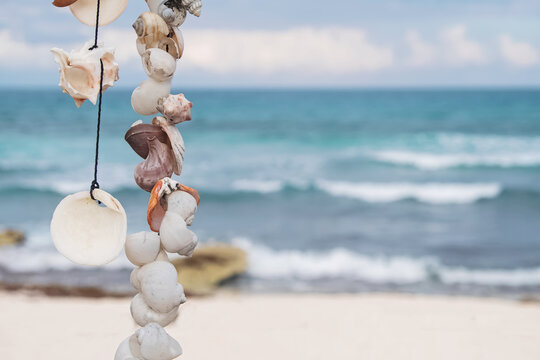 Garland of seashells on the backgound of the sea.