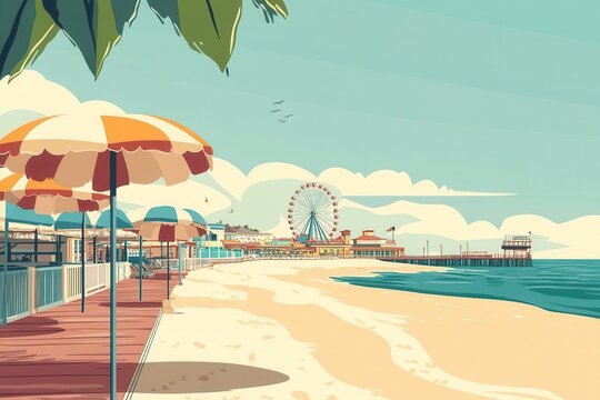 Classic seaside resort features vintage beach umbrellas and a vibrant pier with a ferris wheel on a sunny day by the ocean