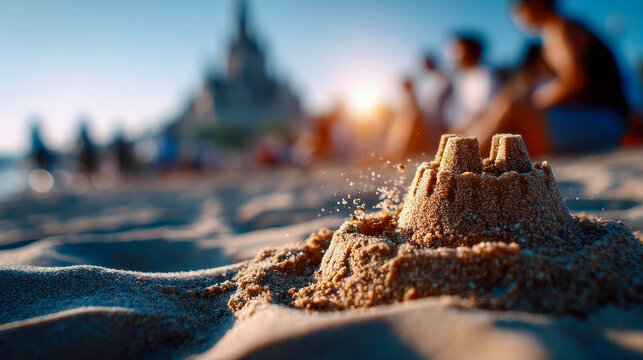 Elaborate sandcastle on beach shore, vacation leisure activity, creative coastal sculpture, temporary art structure, bucket-and-spade construction