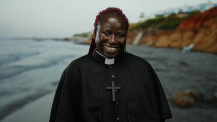 Empowered woman celebrating achievement on seaside adventure
