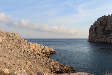 Mediterranean coastline in Marseille, Les Goudes, France. Cliffs of the famous calanques. Blue sky, summer season.