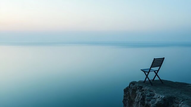 An empty seaside terrace with minimalist furniture overlooks the calm ocean, evoking a sense of solitude and peaceful contemplation at dawn.