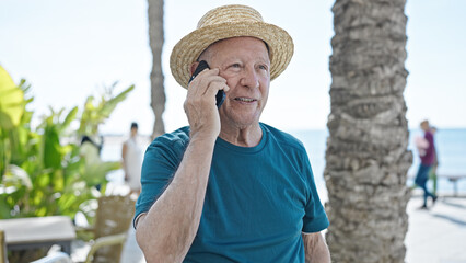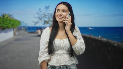 Young beautiful hispanic woman tourist smiling confident talking on smartphone at seaside