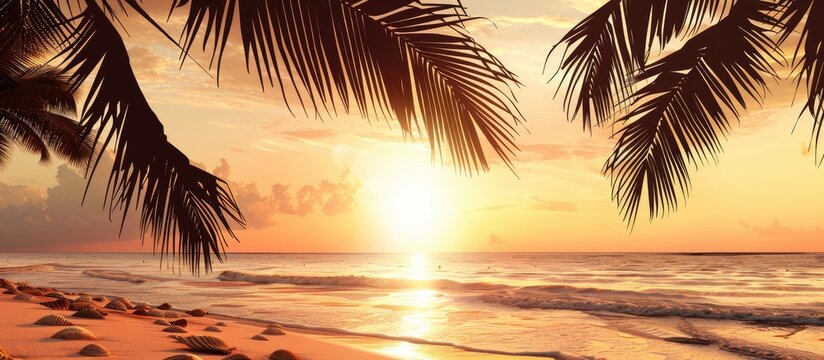 Shady palm tree silhouettes dancing across a beach-inspired scarf adorned with shells, setting the scene for a seaside vacation. Copy space available.