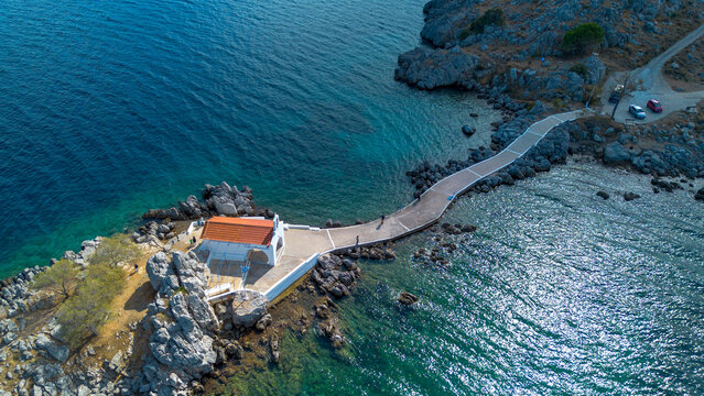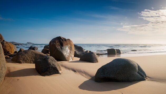 Panoramic view of exotic sandy beach with crystal clear water and phenomenal rock formations. Greece, Halkidiki, Athos peninsula, Trimi beach, Ouranoupolis. Travel, summer holiday, vacation
