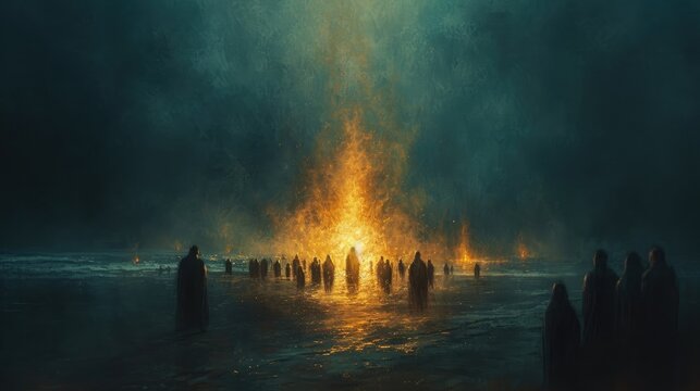 A bonfire on a beach, groups of people gathered around