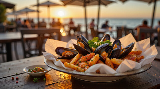 Delicious moules-frites at seaside café during sunset, culinary delight
