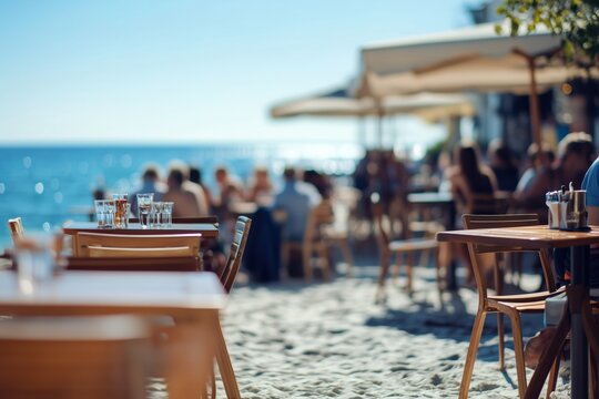 Blurred people sitting at tables in an outdoor beach cafe, with the seashore and sea in the background. Concept of relaxed seaside dining and social gatherings.