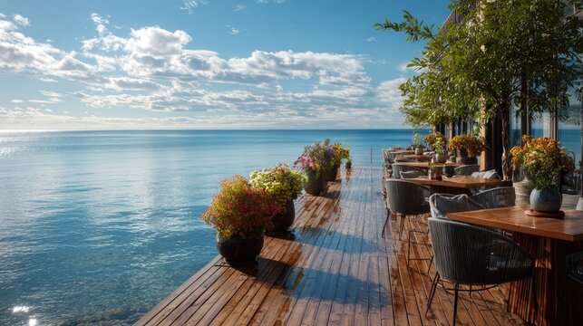 Serenity at a seaside terrace featuring cozy seating and blooming flowers with a stunning ocean view under a clear blue sky