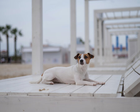 Jack Russell Terrier dog lies on a wooden deck chair on the beach.