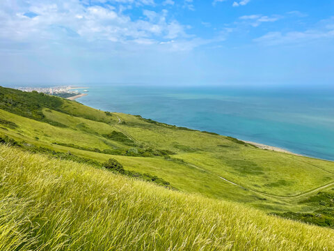 Picturesque green hilly coastline of South England above the turquoise blue sea