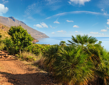 Paradise sea landscape from coastline trail of Zingaro Nature Reserve Park, between San Vito lo Capo and Scopello, Trapani province, Sicily, Italy.