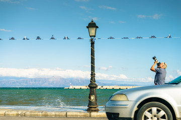 Photographer on seaside promenade capturing waves