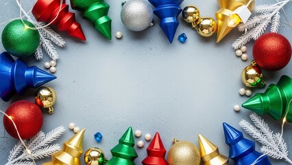 Christmas ornaments create a festive border on a gray surface with colorful baubles and decorative trees evoking holiday cheer and seasonal celebrations perfect for greeting cards or winter promotion