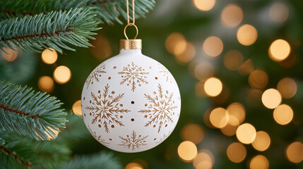 Elegant white christmas ornament with snowflake pattern hanging on fir tree branch, festive holiday decoration with warm bokeh lights, minimal seasonal background for christmas cards, banners, ads