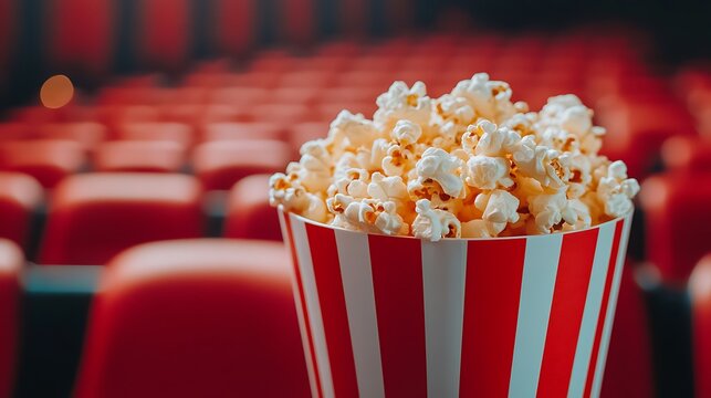 A close-up of a popcorn bucket in a movie theater with empty red seats and a screen in the background. Concept Popcorn Bucket Close-Up, Movie Theater Ambiance, Empty Red Seats, Cinematic Atmosphere