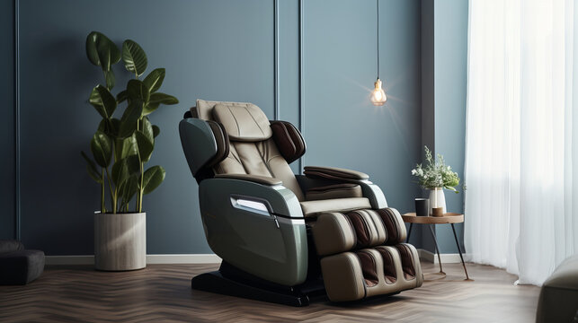 A black leather massage chair sits in a modern living room near a large window, showcasing its sleek design and luxurious features