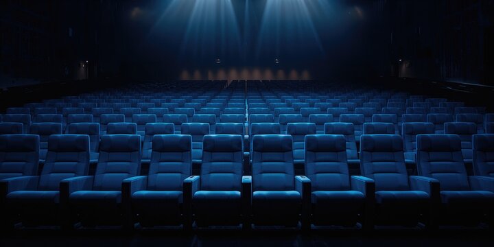 Unoccupied blue theater seats in a movie hall, used for seating arrangement and venue setup