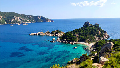 Pristine tropical island bay with clear blue waters and lush green hills