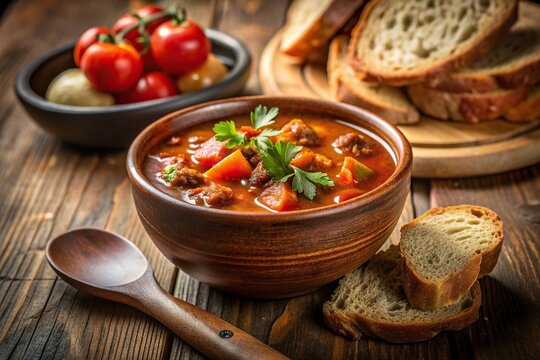steam, appetizing, homemade, spices, food, A close up view of a ceramic bowl filled with goulash soup topped with fresh bread and a wooden ladle seen from a worm s eye perspective