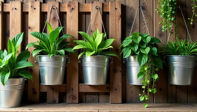 Pallets second life - Potted plants hanging on wooden background with modern aluminium bucket plant pots,  wall pattern,  potted plants
