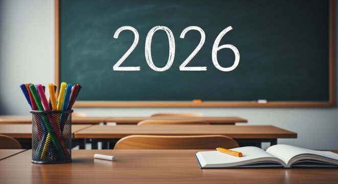 Empty classroom with '2026' on a blackboard, school supplies on a wooden desk