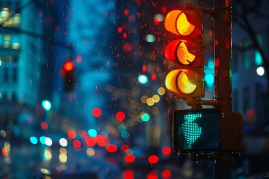 Pedestrian countdown signal displays five seconds remaining at a blurred rainy city intersection at night