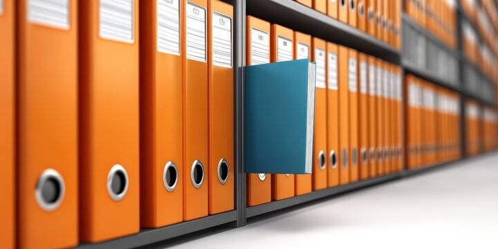 A row of colorful office file folders on shelves, organization of business documents. archive folder document