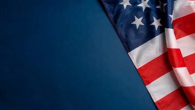 The Corner Section of the United States of America Flag Displayed Diagonally Against a Solid, Deep Navy Blue Background, Providing Ample Copy Space for Patriotic and Political Themes