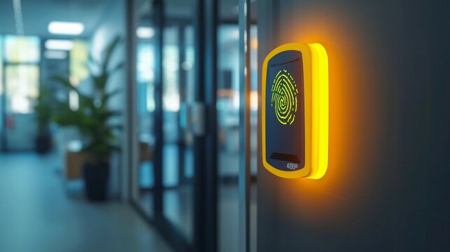 Finger print scan access control system machine on wall near entrance door office generated by ai