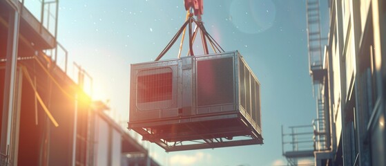 Closeup of a crane lifting a massive HVAC system, showing the secure attachment and lifting process, industrial environment with sunlight and blue sky backdrop, Photorealistic, Highdetail 8K , high-re