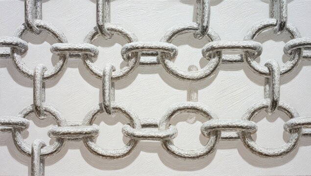 Close-up shows a textured, monochrome artwork of interlocking chain links against a white background