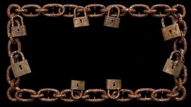 A rectangular frame of rusty chain and padlocks borders a black void, a symbol of confinement