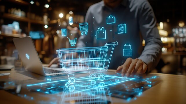 Person Using Laptop with Online Shopping Cart Hologram