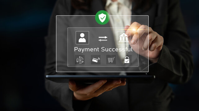 Secure Online Payment Transaction Process concept Person confirming a secure online payment using a credit card through a digital interface with verification tick symbol Internet banki : Generative AI
