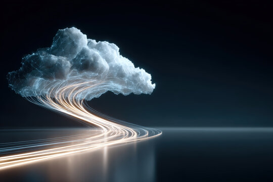 Futuristic 3D render of document, cloud, & data structure, digital, high-tech abstract