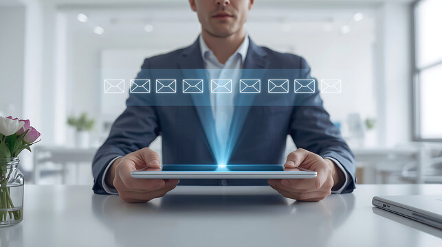 A businessman in a modern office interacts with holographic digital icons while using a smartphone. The scene focuses on technology, cybersecurity, and network communication.