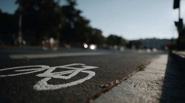 Close-up of a freshly painted white bicycle lane symbol on smooth black asphalt, clear and detailed road marking for cycling path, urban transport infrastructure, safe city commuting concept