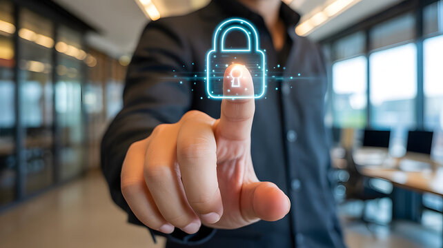 Digital security concept with glowing lock icon touched by businessman in modern office environment