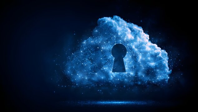 Digital abstract cloud formation with a glowing keyhole symbol representing secure data storage and access isolated on transparent background