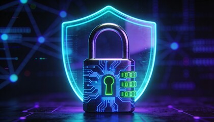 3D Cyber Security Padlock and Shield Icon. Glowing Neon Digital Lock on Dark Binary Code Background. Futuristic Data Protection, Encryption, and Internet Privacy Technology Concept Illustration.