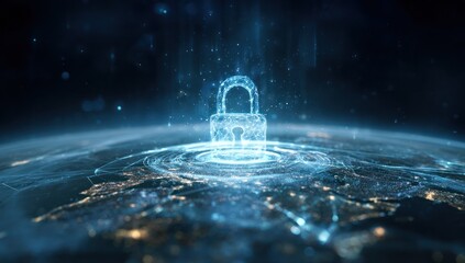 Glowing digital padlock hovers above a dark abstract technological earth surface.