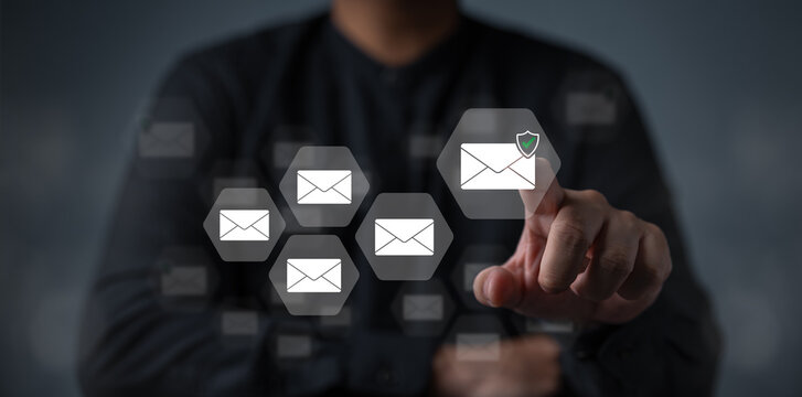 Email security protection from spam virus. Man check on secure inbox email, Security protection notification on internet letter security protect, junk and trash mail, and compromised information.